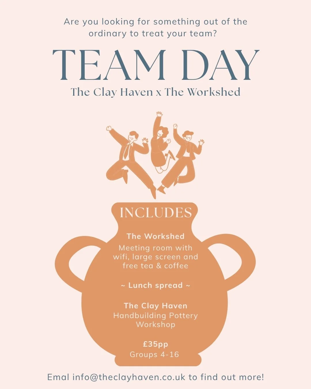 We're partnering with the Workshed, Liskeard to offer you and your team to offer you the perfect setting to meet, eat and then relax with an interactive pottery experience.